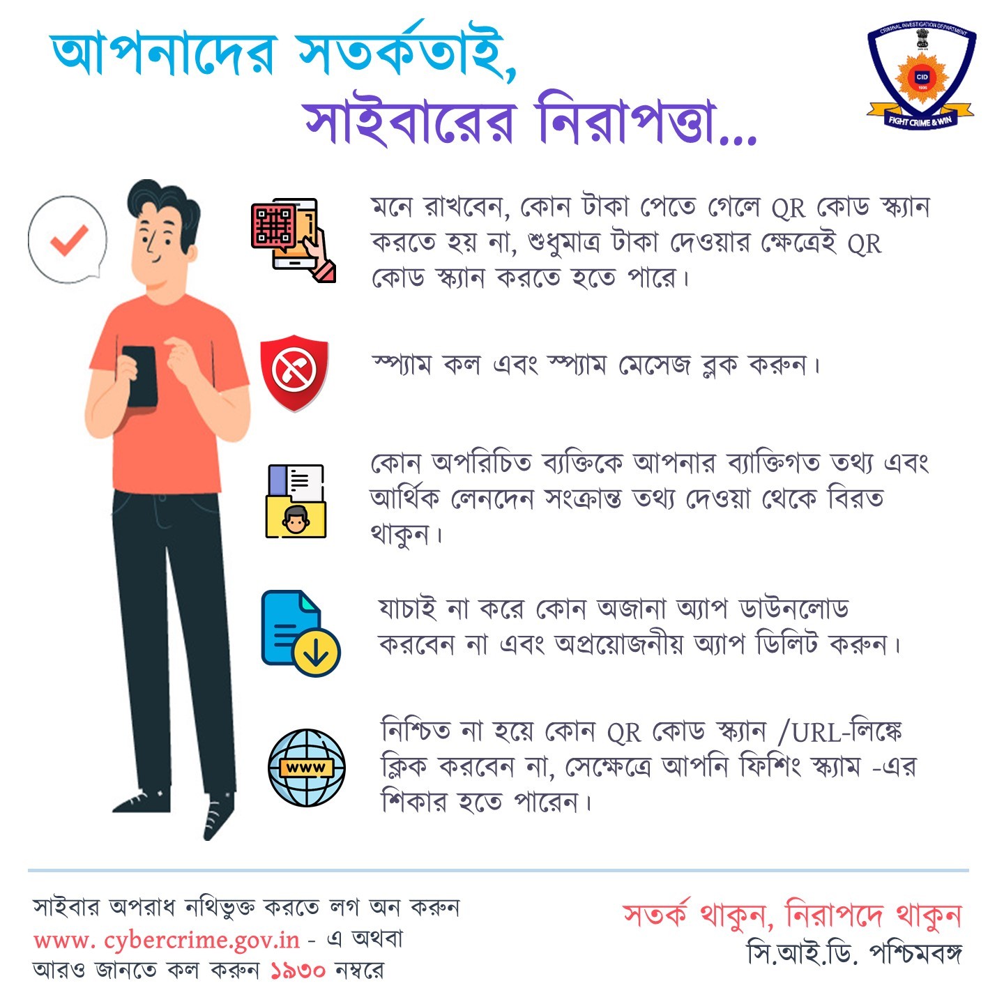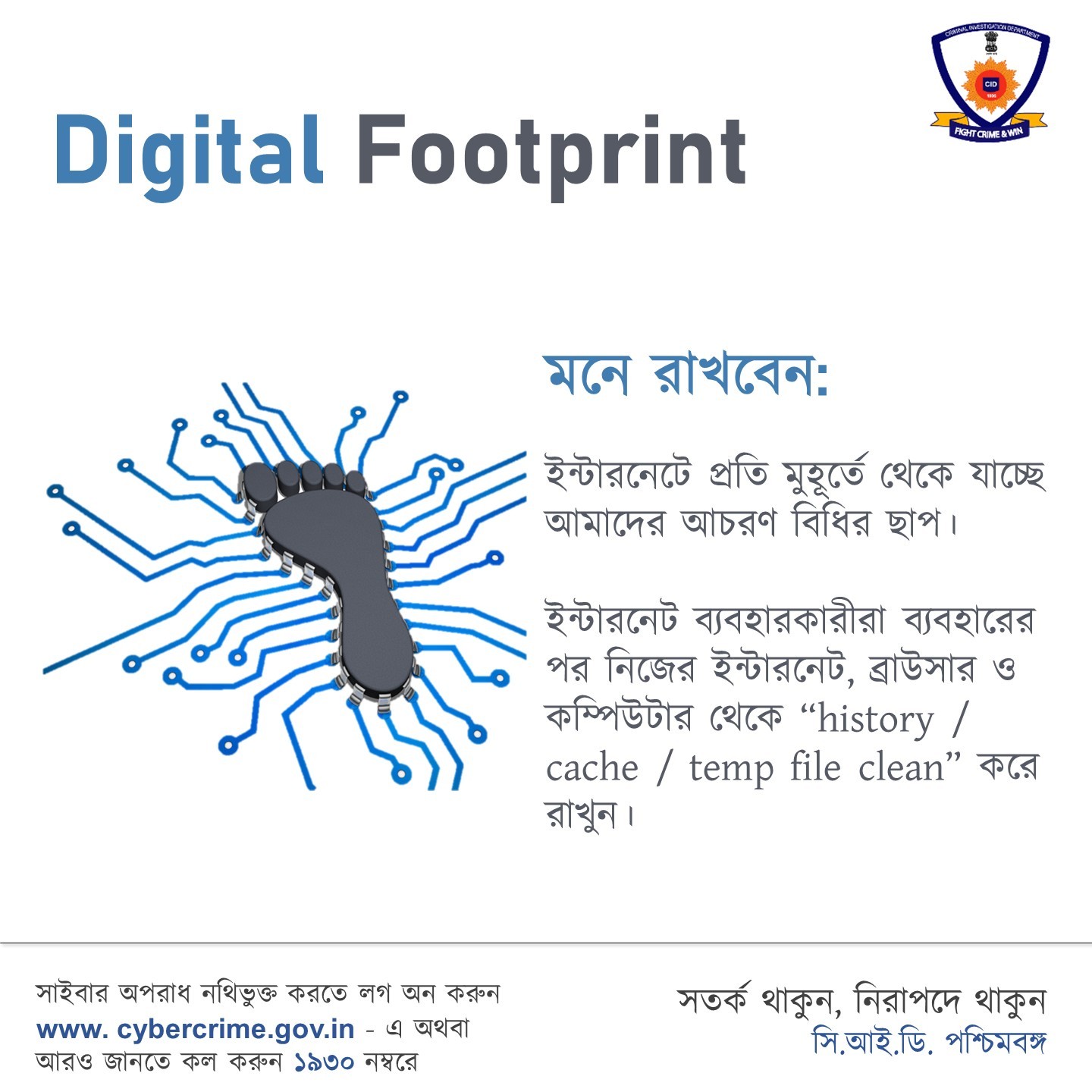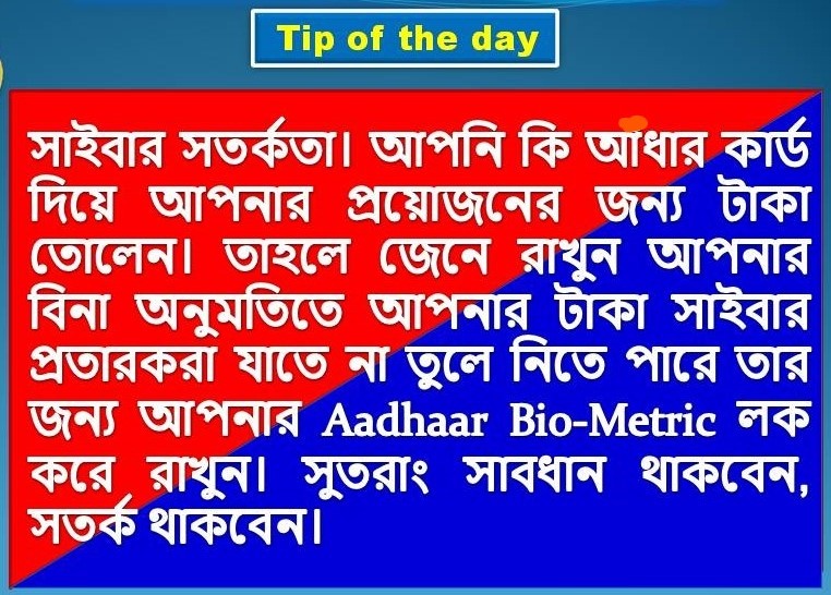 আপনার ব্যক্তিগত তথ্য যেমন আধার কার্ড, ভোটার আইডি, প্যান কার্ড, এটিএম পিন, আপনার ছবি, ব্যক্তিগত ভিডিও ইত্যাদি যেন সাইবার অপরাধের বিষয়বস্তু হয়ে, আপনার ক্ষতির কারণ না হয়।